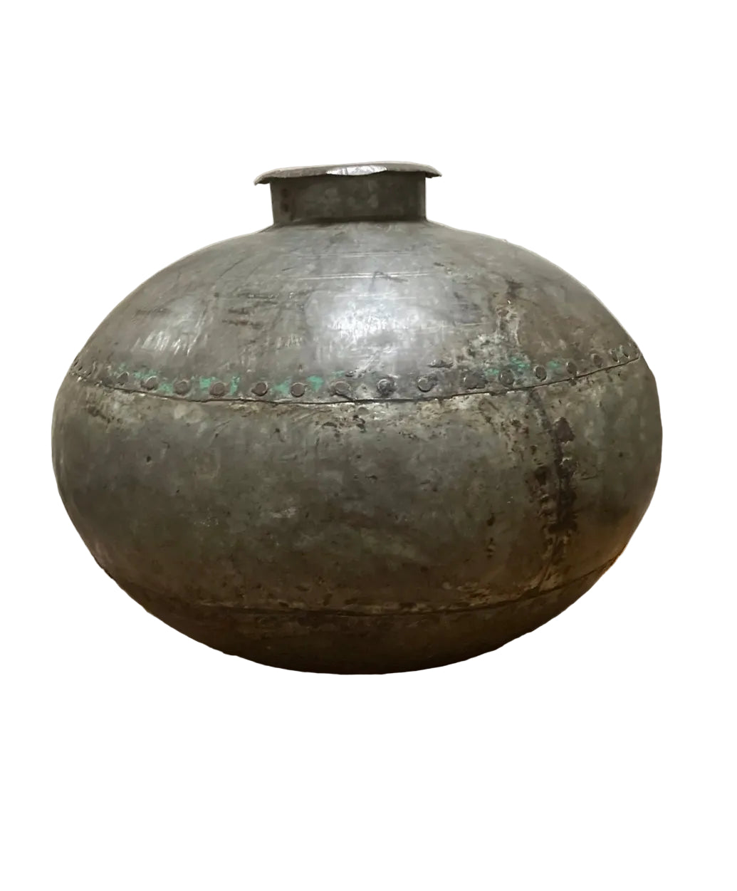 A vintage water vessel in copper from Rajasthan, traditionally used by women to carry water from wells and rivers. It features hand-beaten, hammered texture and riveted construction. The copper has a natural, rustic patina.