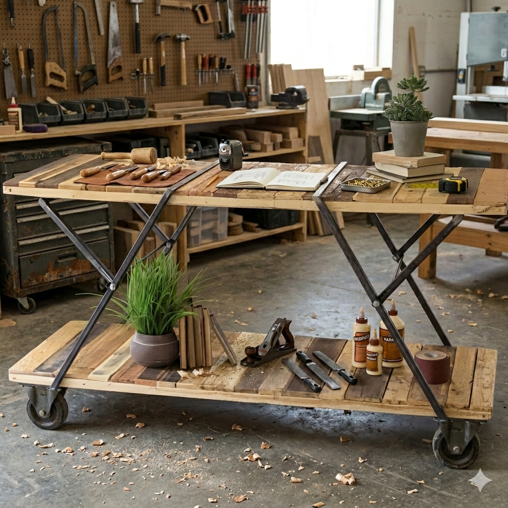 طاولة العمل/العرض الضخمة هذه عبارة عن قاعدتين حديديتين مع لوحين من الخشب المستصلحة - واحدة في الأسفل والأخرى في الأعلى. هذه الطاولة الكبيرة تمثل جزيرة مطبخ ممتازة أيضًا، مع مساحة تتسع لـ 8 مقاعد مرتفعة.