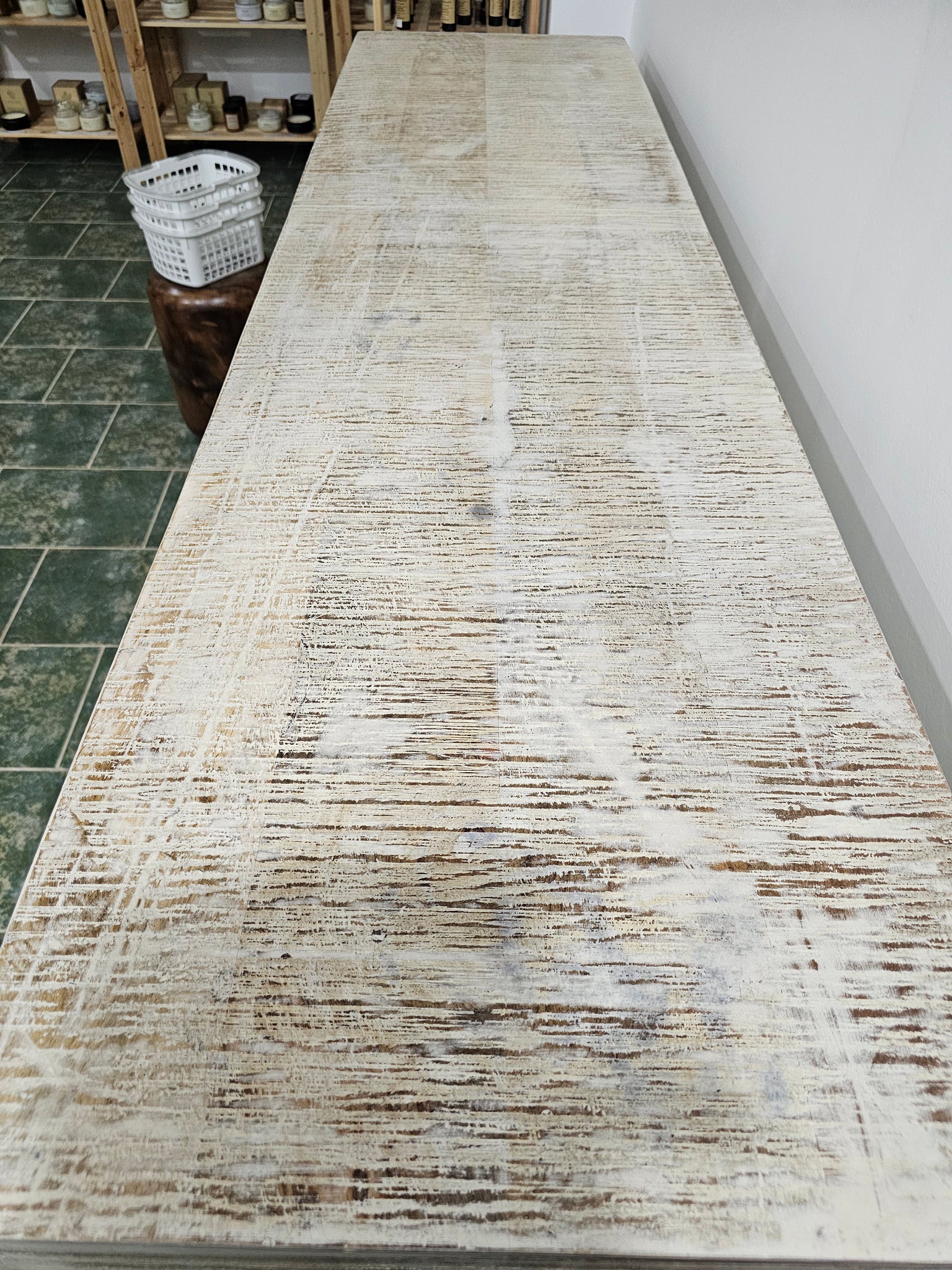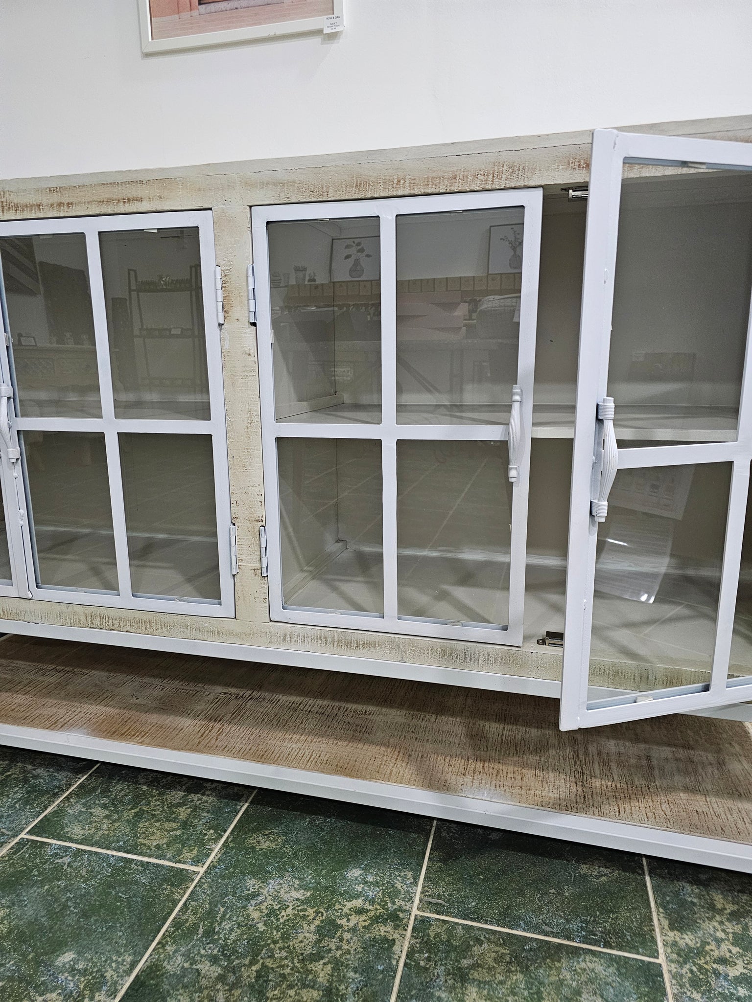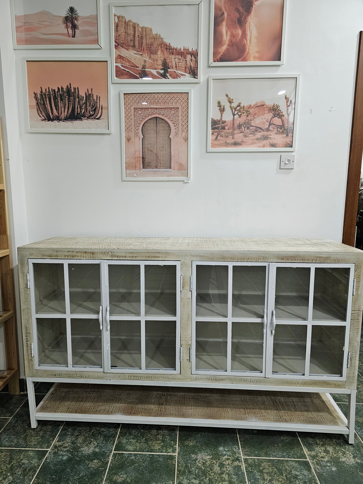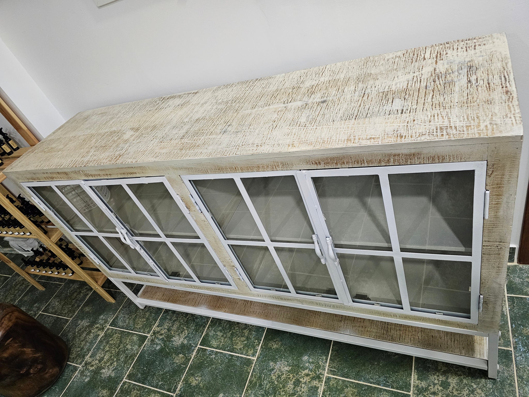 This distressed white buffet / cabinet, with four shelves (inside the two cabinet doors) and a lower shallow shelf, is made from beautiful Indian mango wood. Perfect for use in the dining room to store linens, decorative platters and bowls; with plenty of serving space on top. Enjoy extra storage with this beautifully styled piece.
